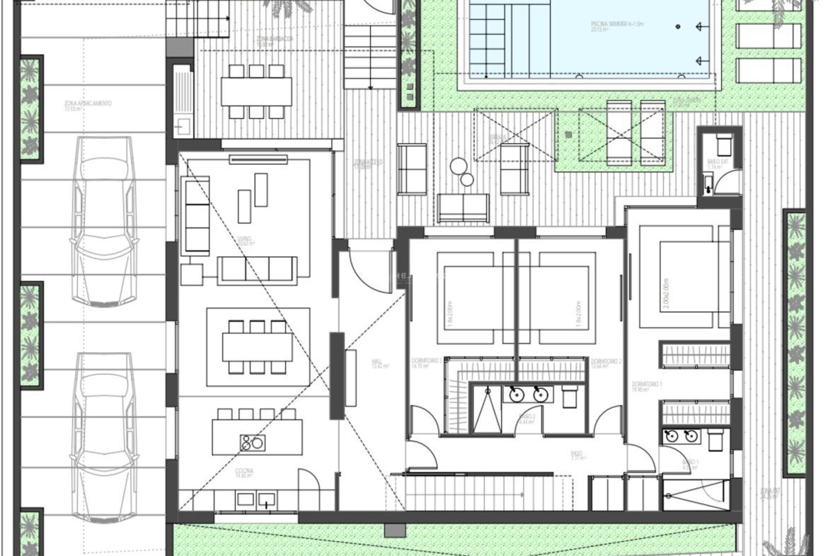 We offer 15 independent single-storey villas with a built-up area of 391 m². The ground floor, with an area of 157 m², consists of 3 bedrooms, 2 bathrooms and an additional toilet, right by the pool. There is also a spacious living room connected to the kitchen, distinguished by an impressive double-height ceiling. The solarium floor of 85 m² has been prepared for the installation of a jacuzzi and is equipped with a bar with a sink.