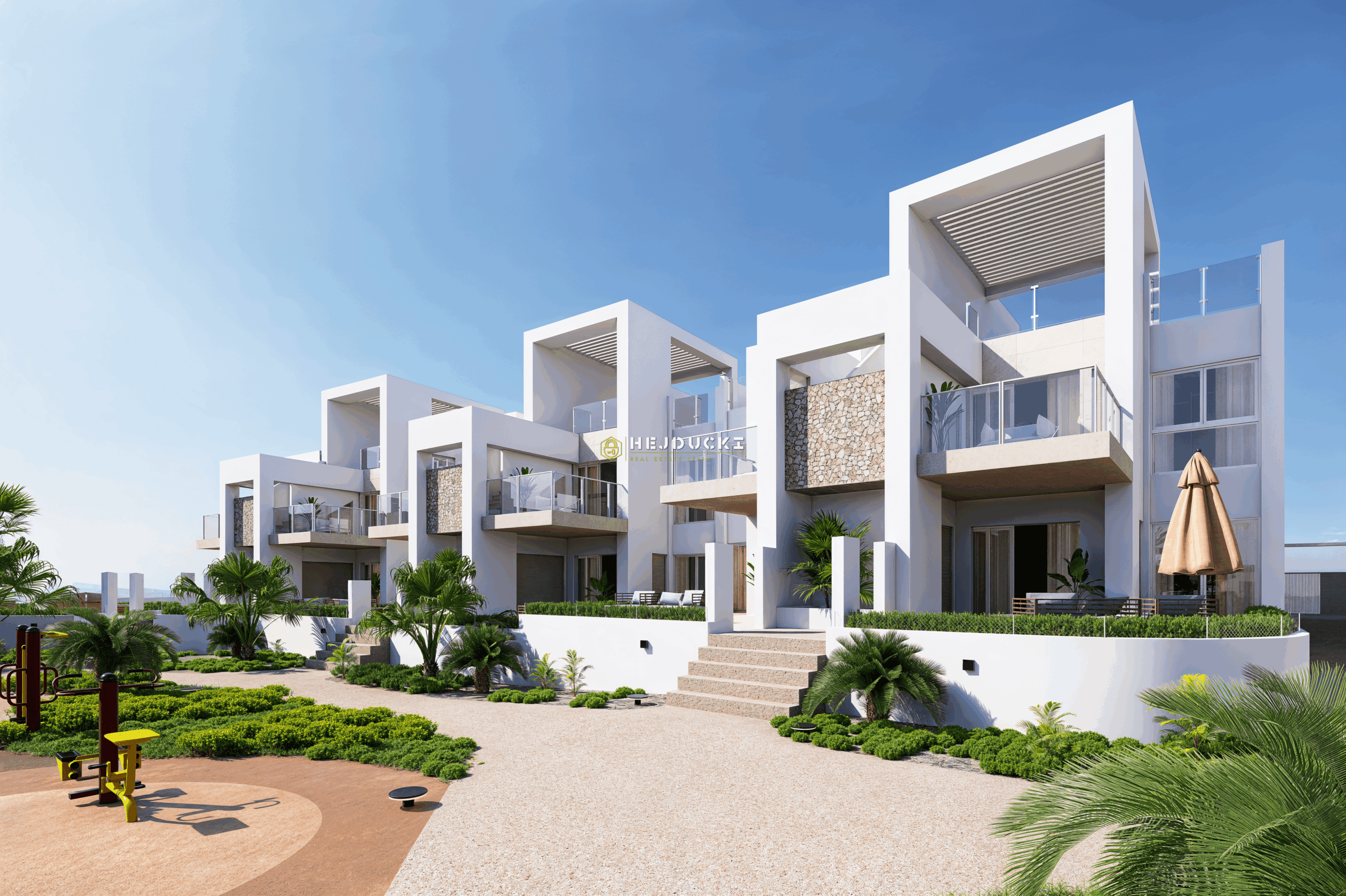 For sale located in the town of Ciudad Quesada, this private residential complex offers newly built bungalows ranging from 74 m² to 86 m², priced between €281,000 and €354,000. The bungalows for sale are available with 2 or 3 bedrooms, designed in a minimalist style and built to the highest quality standards. The modern architecture blends perfectly with open spaces and natural surroundings, creating a peaceful and unique atmosphere. Alicante Airport is just 40 minutes away, and nearby there are two beautiful salt lakes one pink and one green. The sandy beach of Guardamar del Segura is only a 10-minute drive away. Contact us for more information, we have special surprises for those who reserve these bungalows.