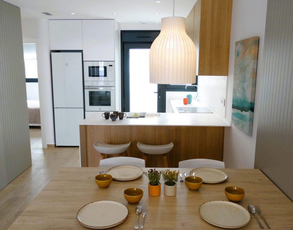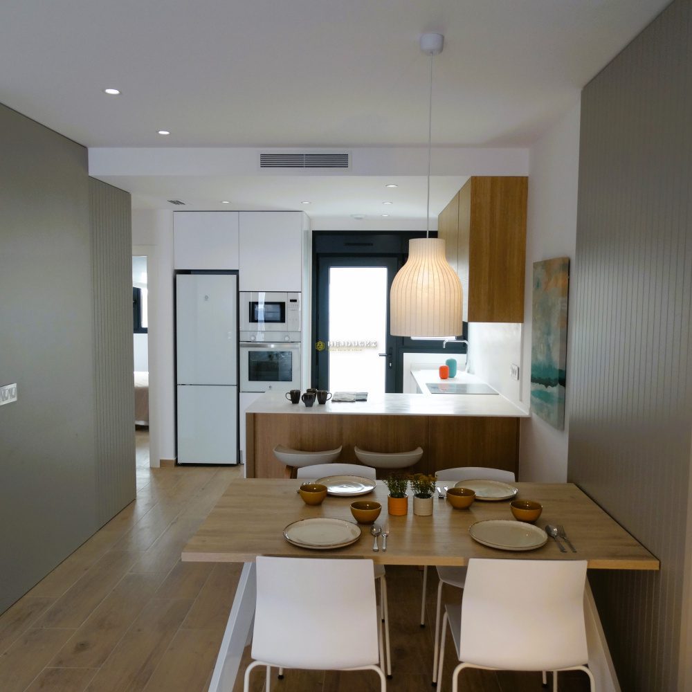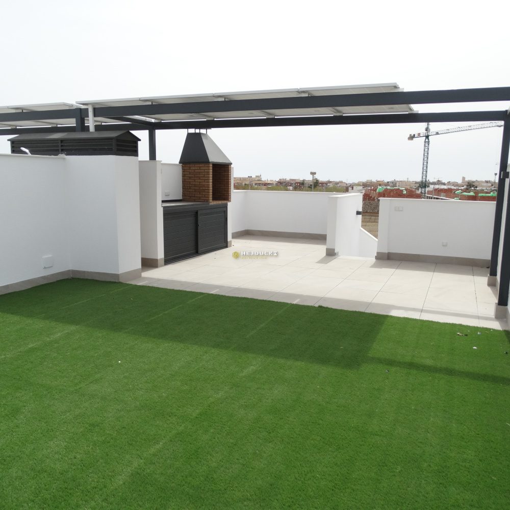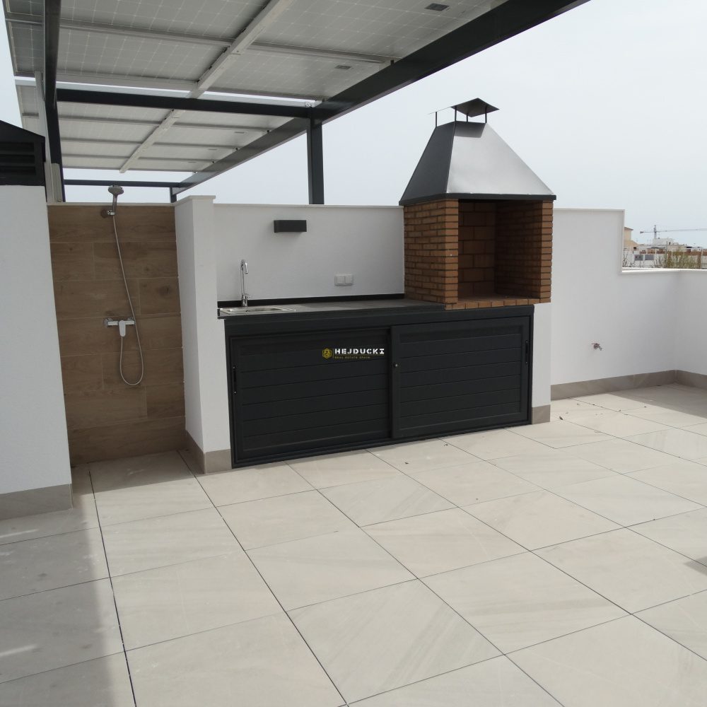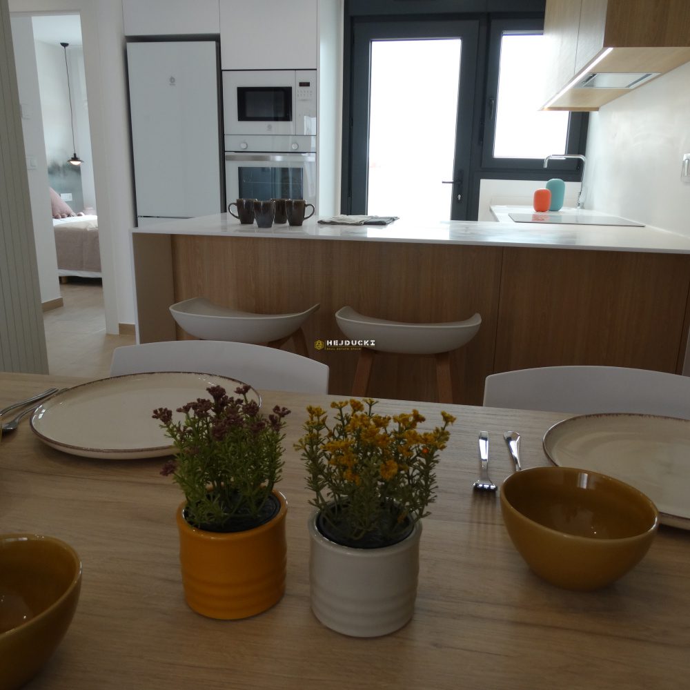 Another phase of terraced bungalows in Pilar de la Horadada. The houses have 2 bedrooms, 2 fully furnished bathrooms, a living room with access to the terrace. Upper bungalow priced from euro 285,000. Pilar is a town located south of Alicante, about an hour and twenty minutes from the airport. The wide, sandy beach is just over 2 km away, all bars and shops are on site. An ideal offer for a holiday break or permanent residence. Feel free to contact us.