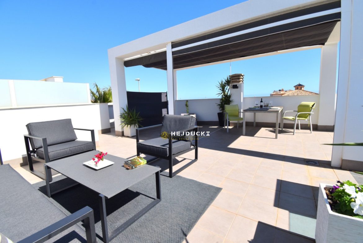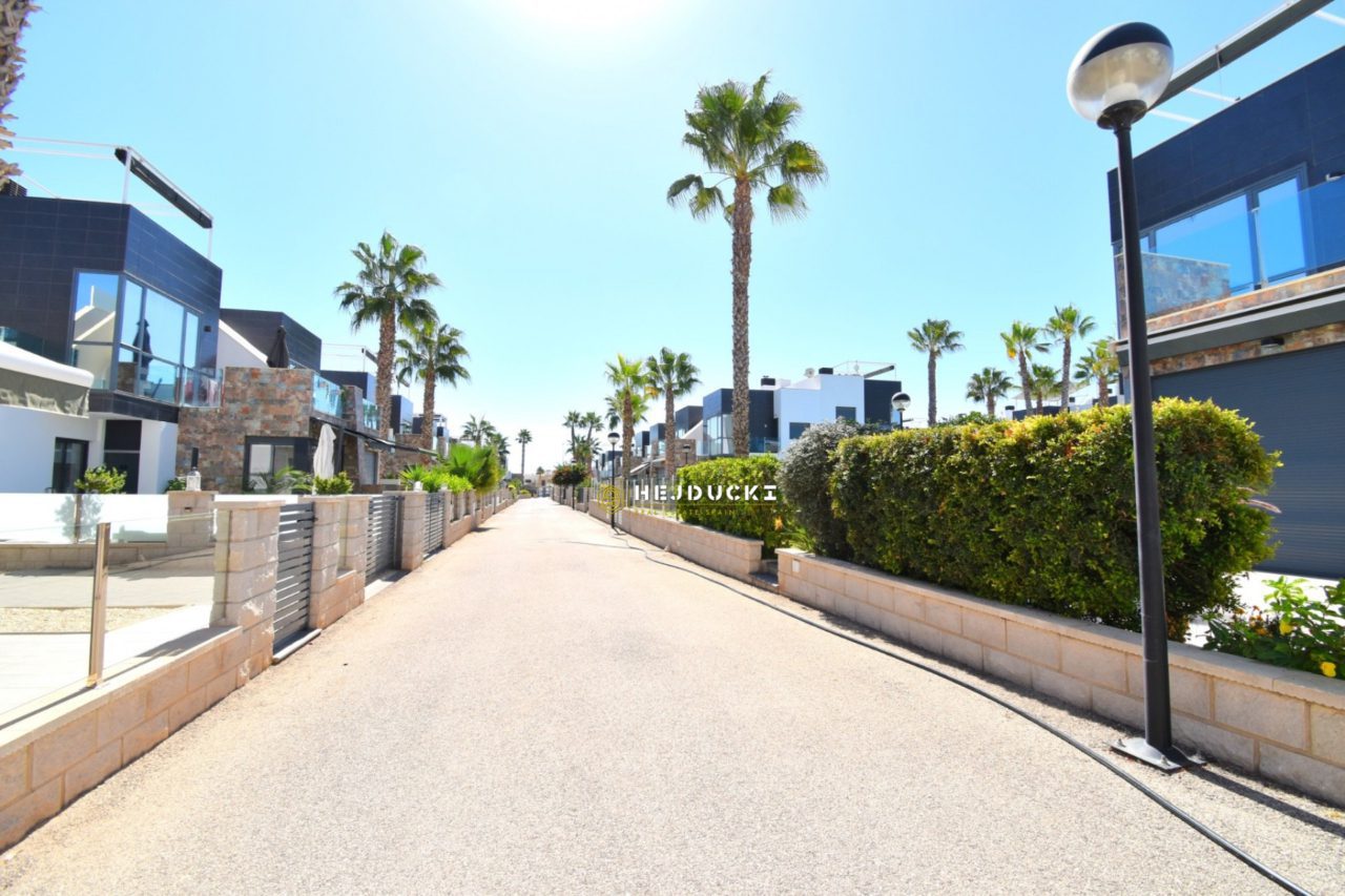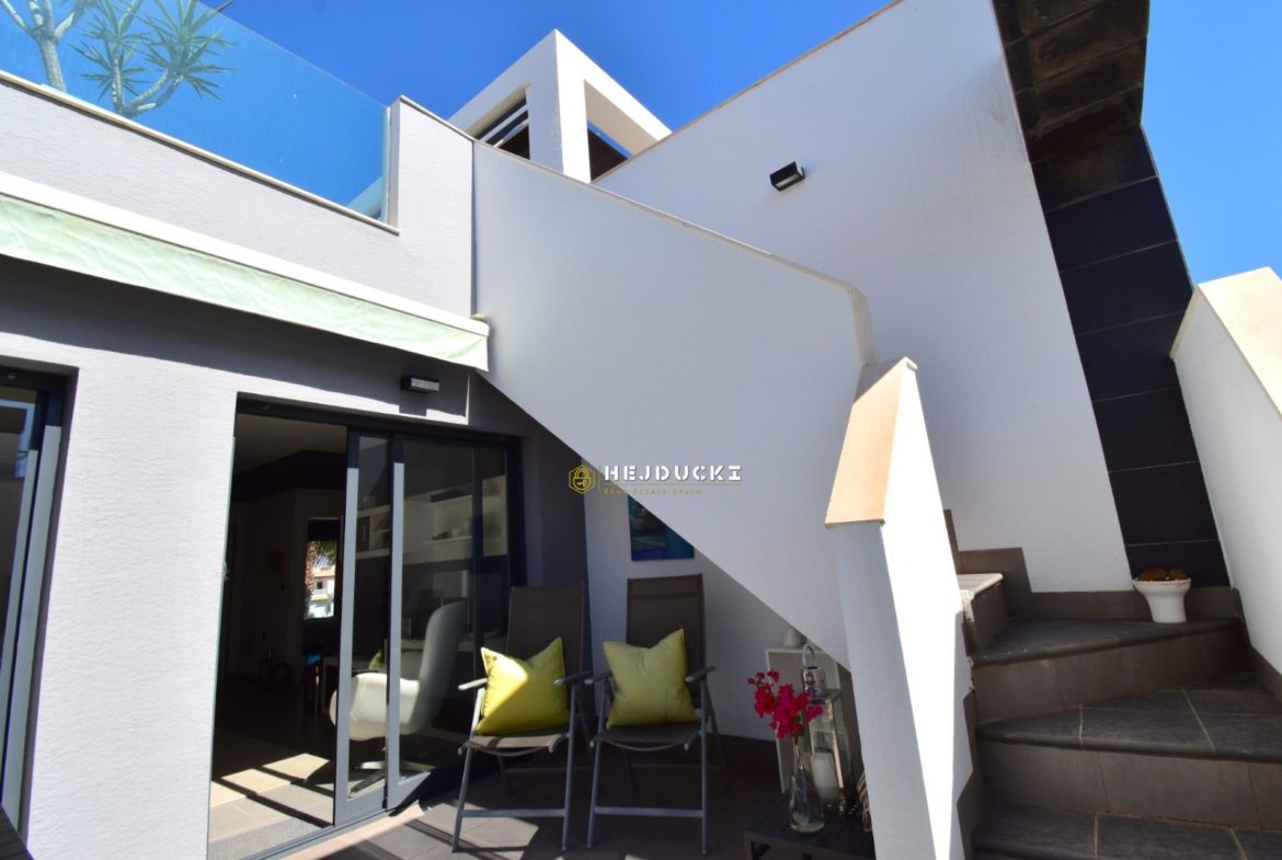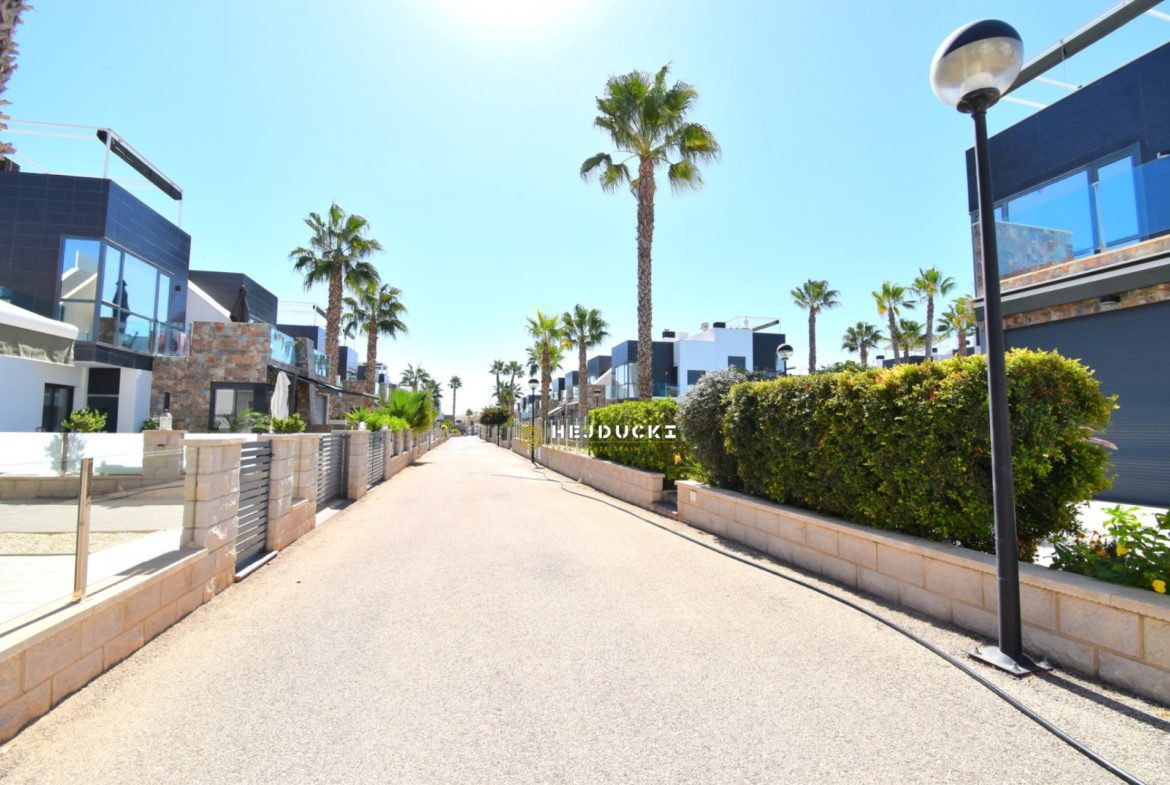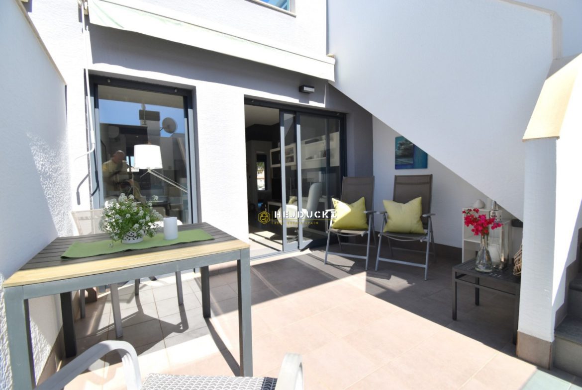 Lovely modern bungalow with solarium for sale in Lomas de Cabo Roig. Ideal for a family holiday as there is something for everyone. On the estate we have swimming pools, a playground and distance only a 5-minute drive to the sandy beach. The N332 national road runs right next door, making it easy for us to get to Alicante airport or the other way to Cartagena.