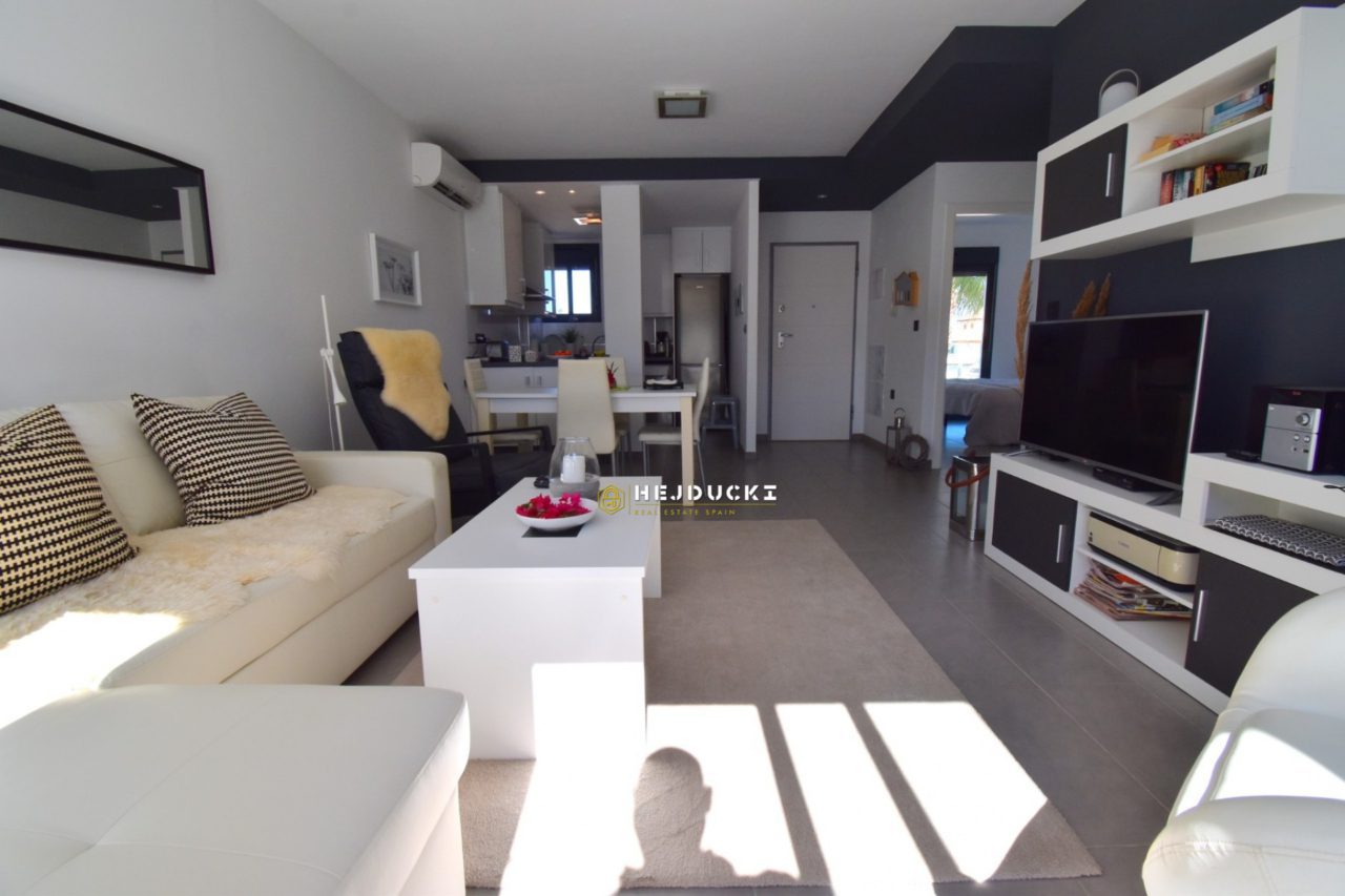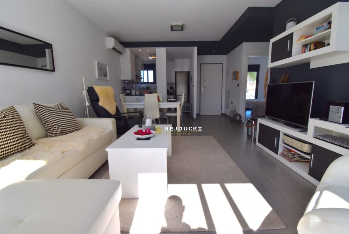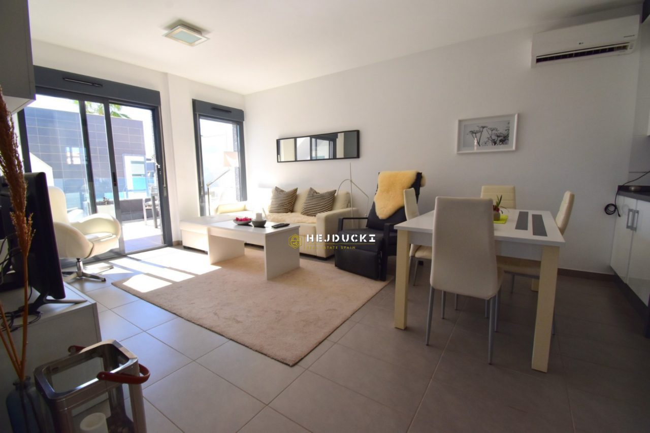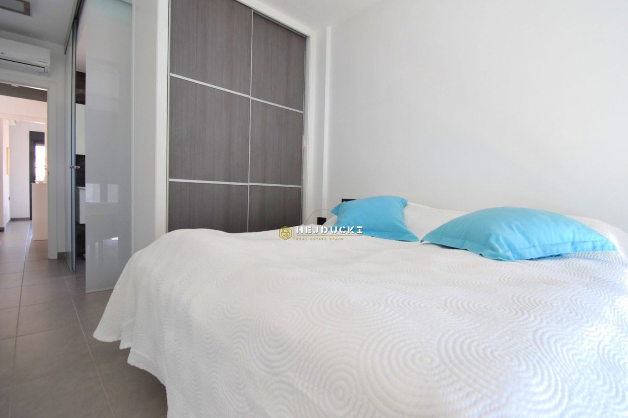 Lovely modern bungalow with solarium for sale in Lomas de Cabo Roig. Ideal for a family holiday as there is something for everyone. On the estate we have swimming pools, a playground and distance only a 5-minute drive to the sandy beach. The N332 national road runs right next door, making it easy for us to get to Alicante airport or the other way to Cartagena.
