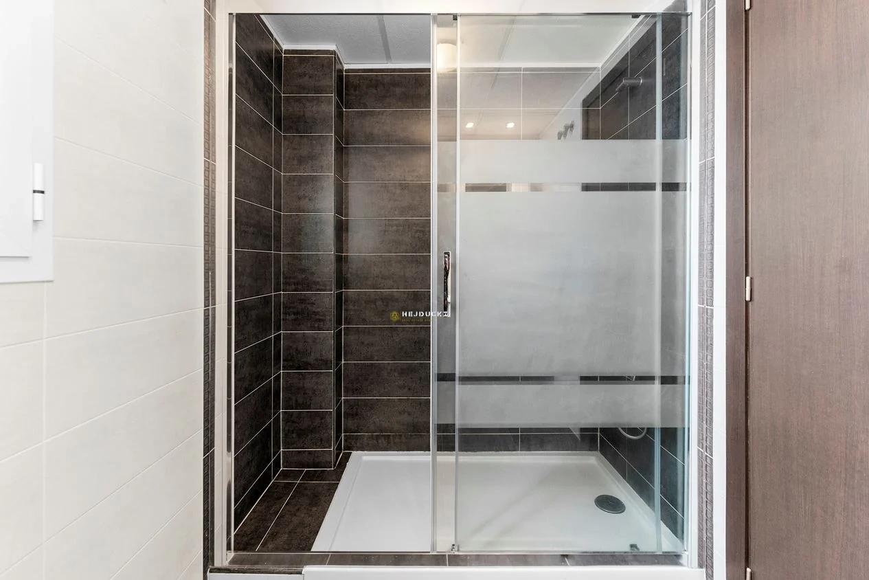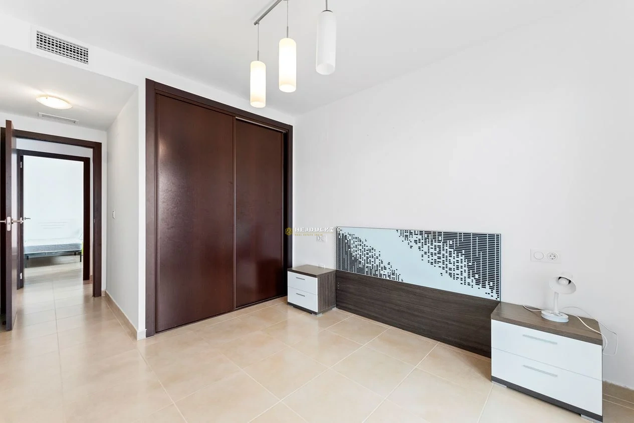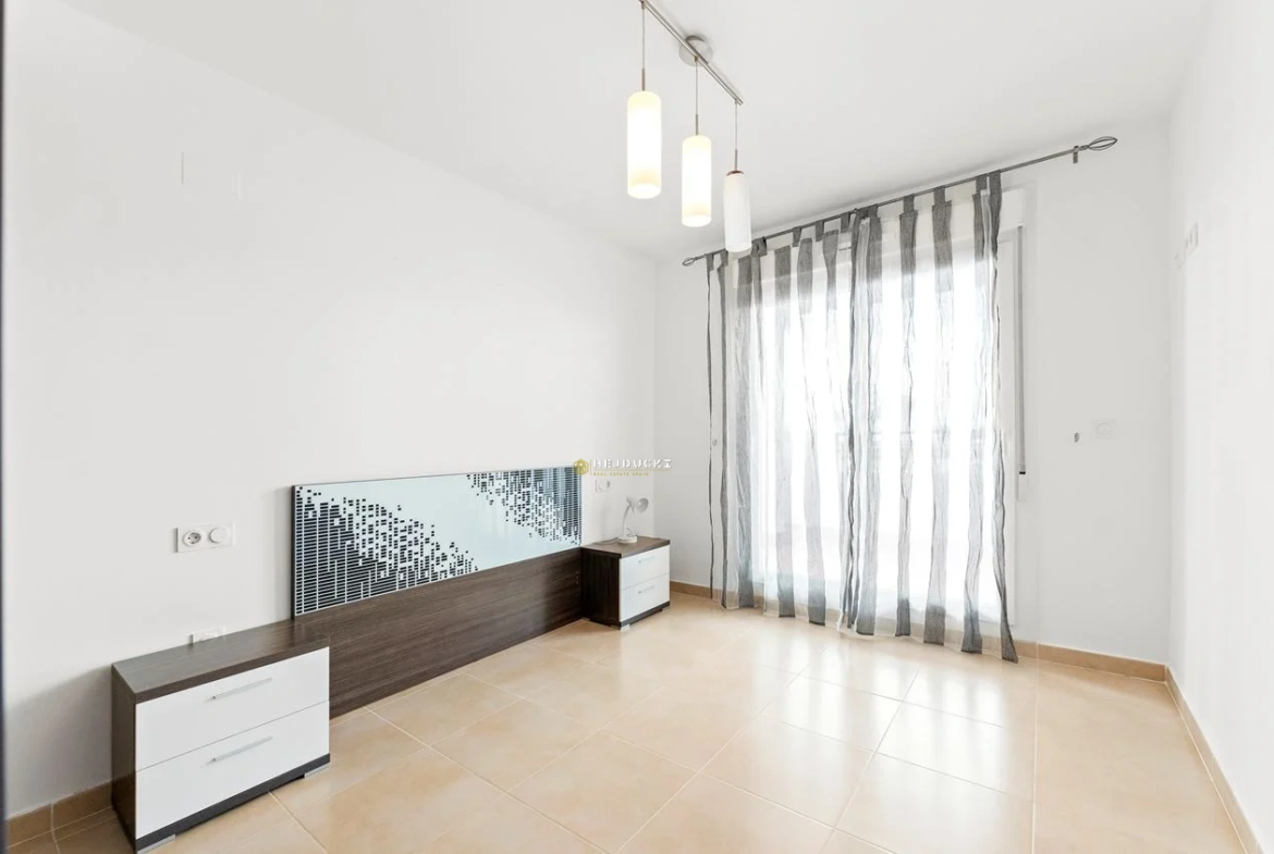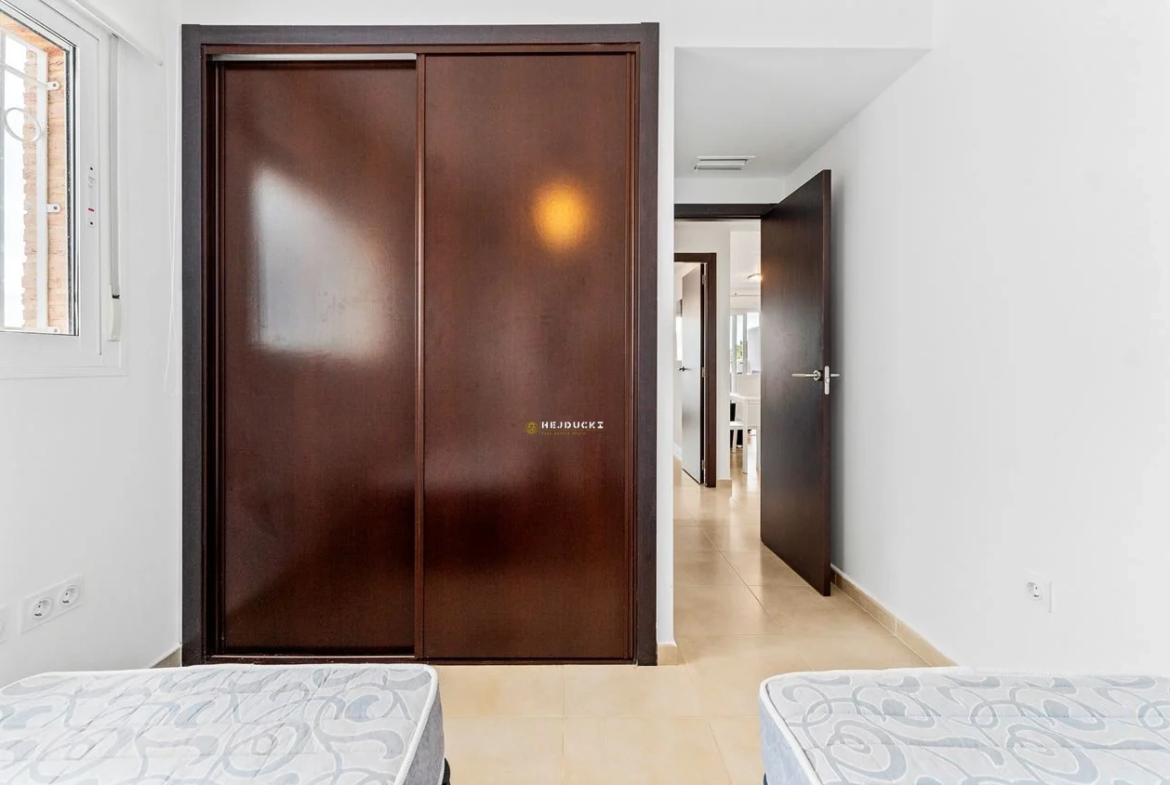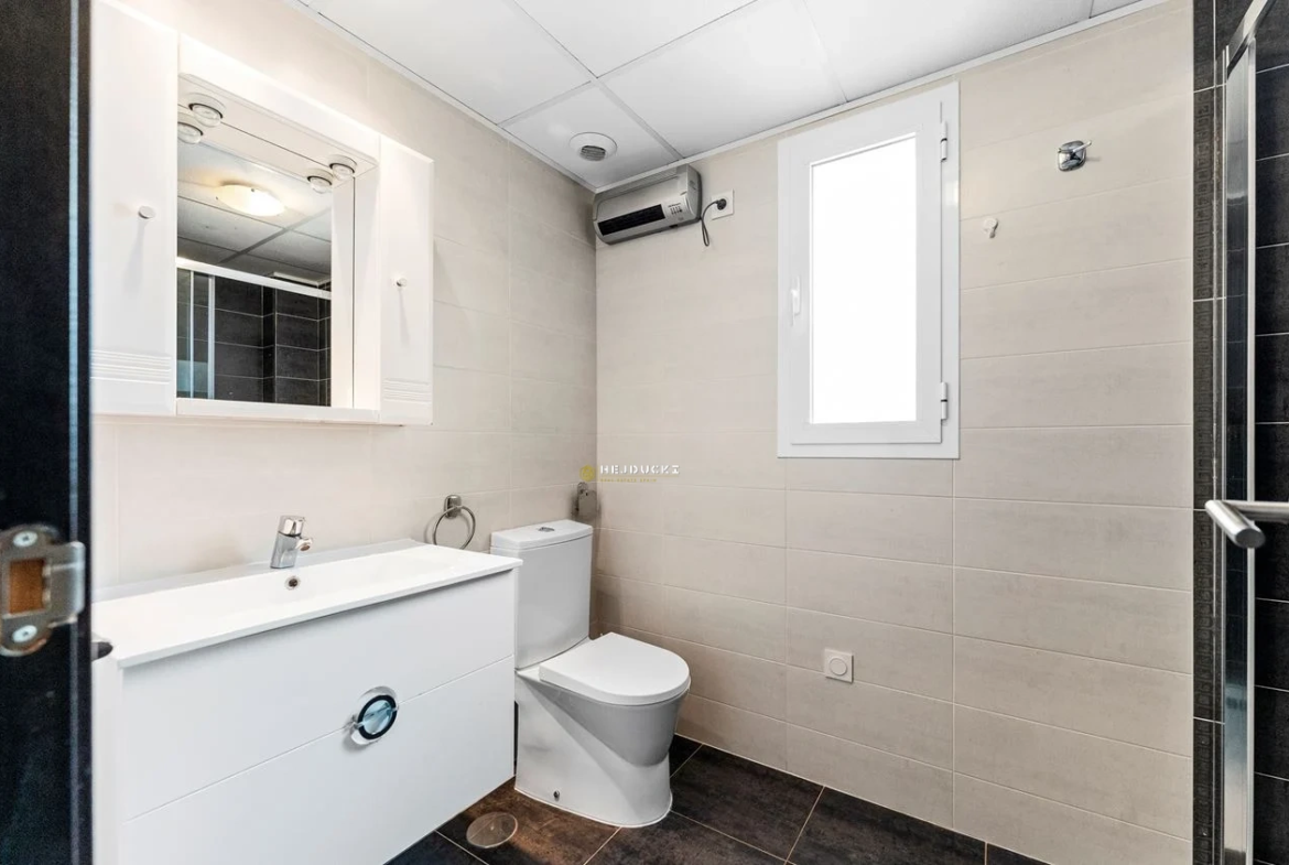 Przestronne sypialnie z wbudowanymi schowkami i miejscem na podwójne łóżko, a jedna z łazienek jest połączona z główną sypialnią z nowoczesną łazienką i kabiną prysznicową. Druga łazienka ma to samo stylowe wnętrze, również z prysznicem. W okolicy znajduje się nienumerowany parking, a dom ma zintegrowaną klimatyzację.