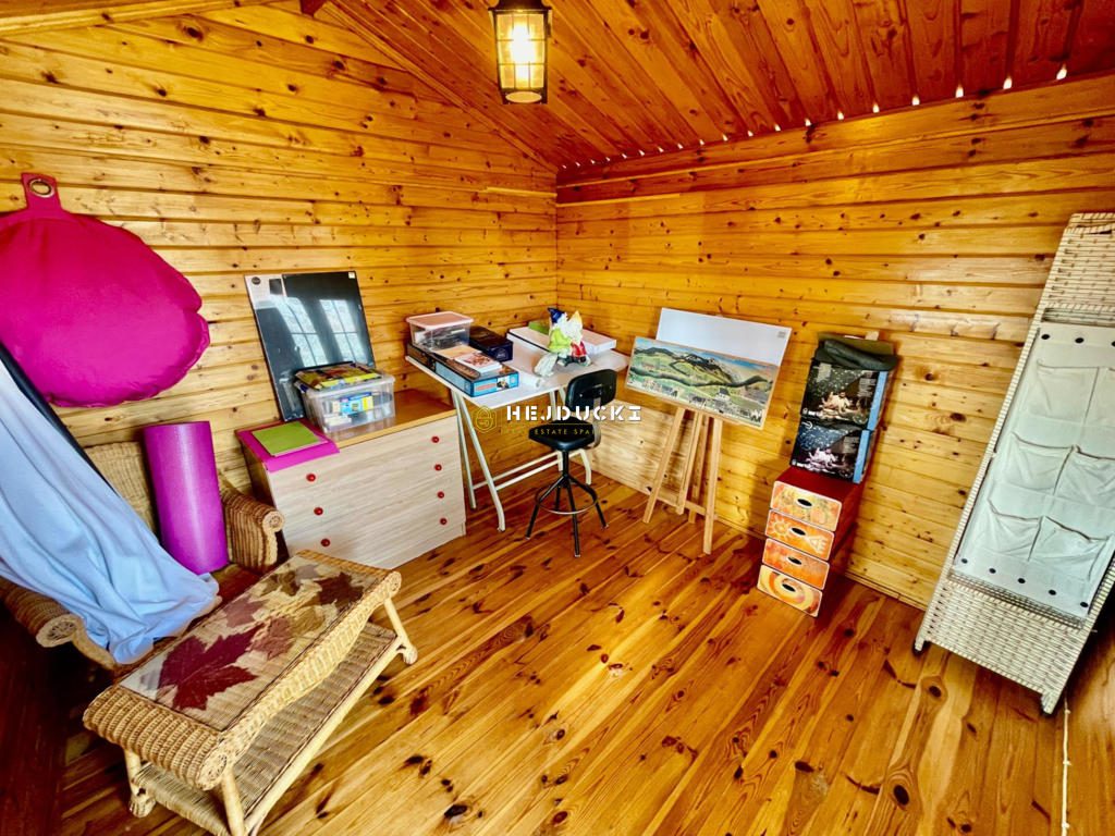 Zamknięta weranda to przestrzeń o ogromnym potencjale, idealna do przekształcenia w ogród zimowy. Ponadto pod werandą znajduje się pomieszczenie gospodarcze, które ułatwia przechowywanie rzeczy. Na działce znajdziesz wszystko, czego potrzeba, by cieszyć się życiem pod hiszpańskim słońcem. Letnia kuchnia z grillem jest idealna na spotkania z rodziną i przyjaciółmi. Domek z drewna, obecnie wykorzystywany jako pracownia artystyczna. Prywatny basen 4×8 m do orzeźwienia w gorące dni.