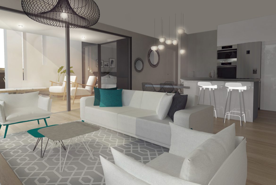 Stylowe dwupiętrowe wille z podwójnymi przesuwanymi szklanymi drzwiami, które otwierają się bezpośrednio na taras z prywatnym basenem, ogrodzonym ogrodem i parkingiem przy drodze. Taras na pierwszym piętrze oferuje słońce przez cały dzień.