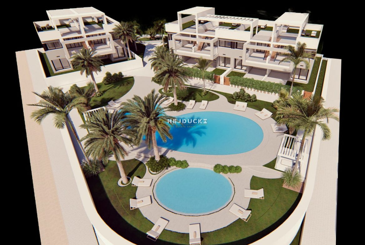 Resort oferuje idylliczne krajobrazy a część wspólna składa się z 3 obszarów basenowych, jacuzzi, fitness, kort tenisowy paddle, mini golf, obszar dla dzieci, punkt ładowania pojazdów elektrycznych … i wiele więcej! Jego pierwszorzędne udogodnienia i tereny zielone pozwolą cieszyć się z rodziną i przyjaciółmi 320 dniami słońca oferowanych przez Costa Blanca. Domy mają ponad 131m2 rozmieszczone w przestronnym salonie-jadalni z otwartą kuchnią, 2 dużymi sypialniami i 2 łazienkami. Możliwość wyboru pomiędzy bungalowami na parterze z 2 dużymi prywatnymi tarasami, aby cieszyć się klimatem Costa Blanca lub bungalowami na drugim piętrze o powierzchni 178m2 z solarium o powierzchni 85m2 z panoramicznym widokiem na Laguna Rosa i Morze Śródziemne.